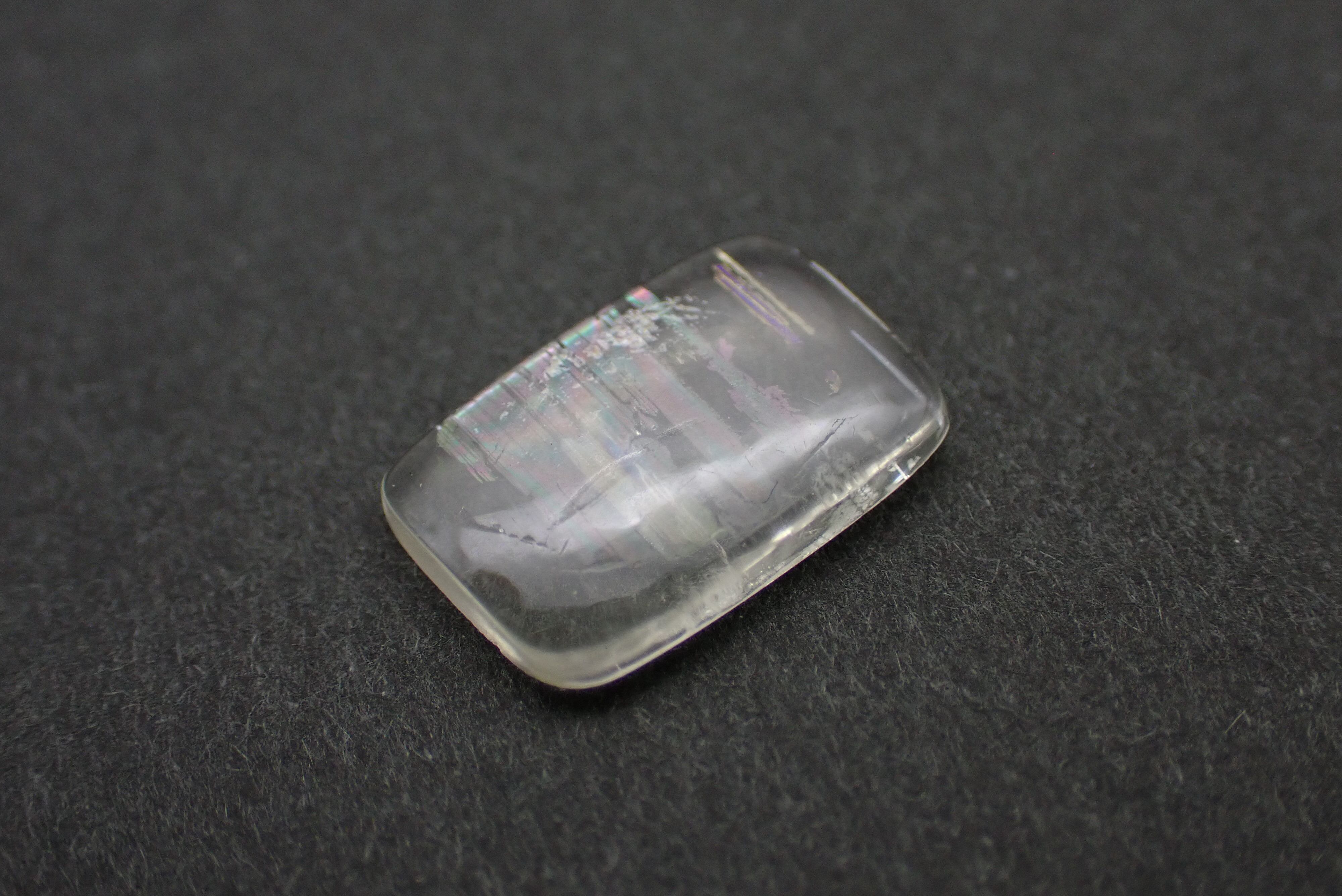 通常のムーンストーンとは異なるレインボーのシラーが特徴で、全体の柔らかいカラーの中にふとした時に見える鮮やかな色味がとても上品に光ります。