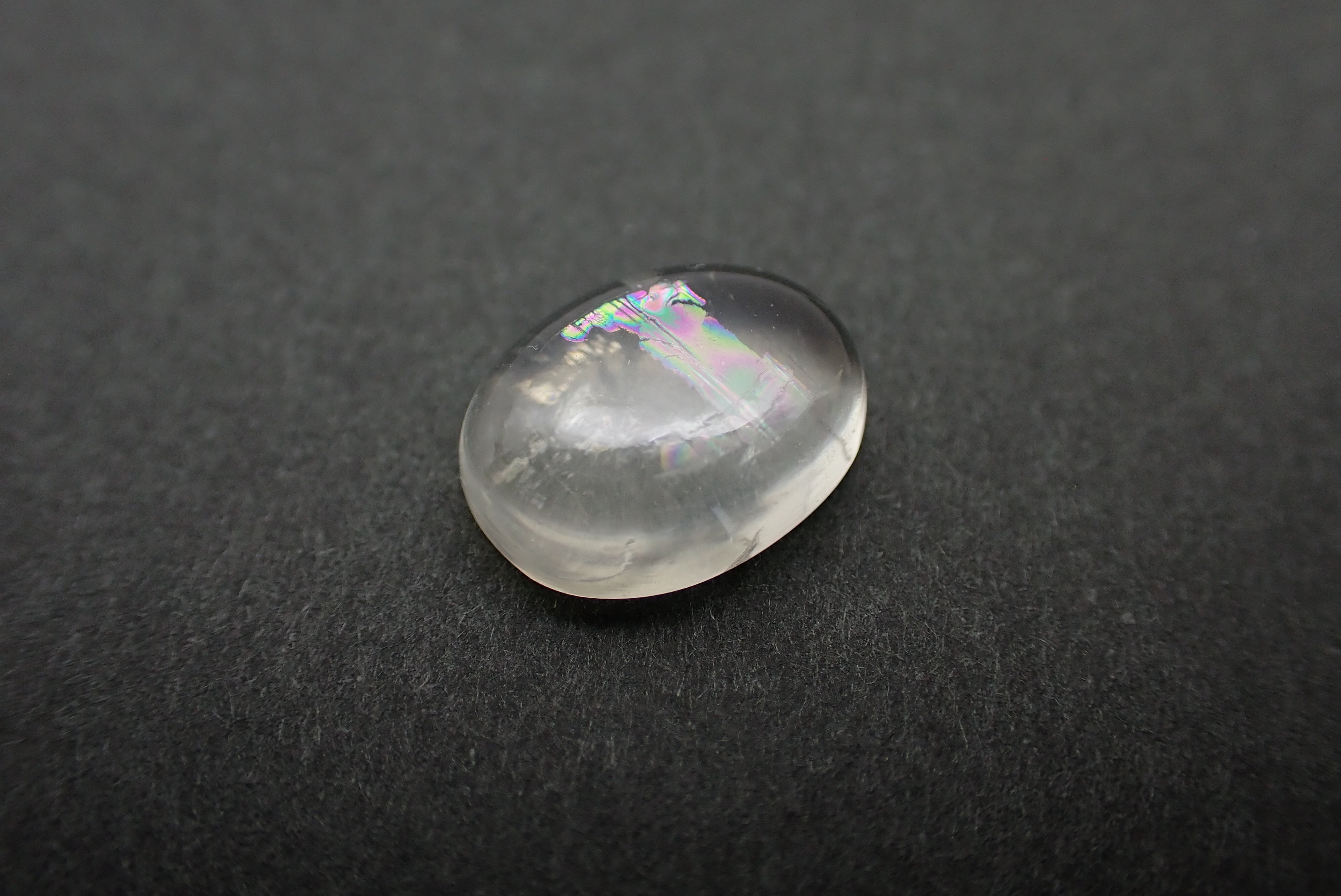 通常のムーンストーンとは異なるレインボーのシラーが特徴で、全体の柔らかいカラーの中にふとした時に見える鮮やかな色味がとても上品に光ります。
