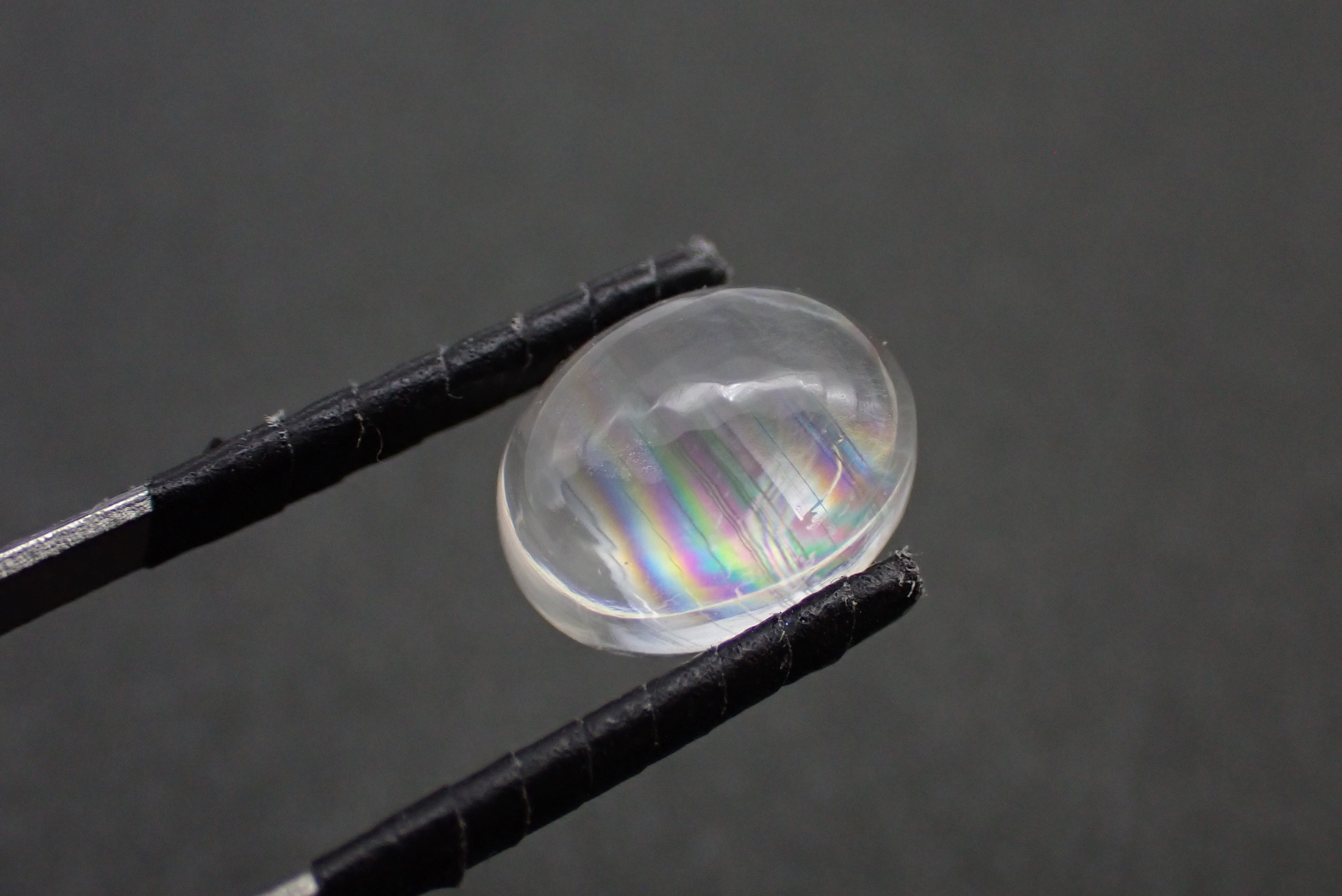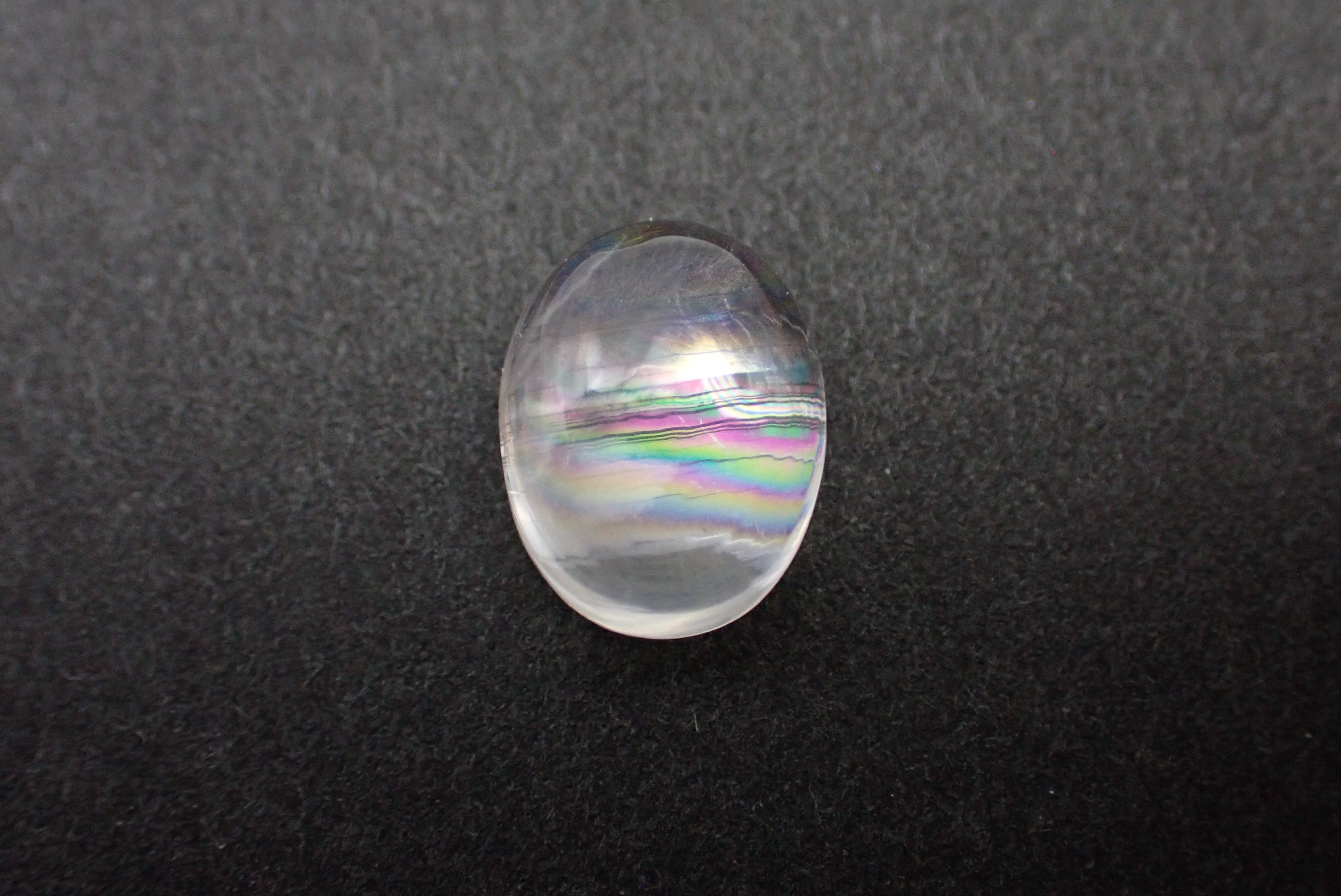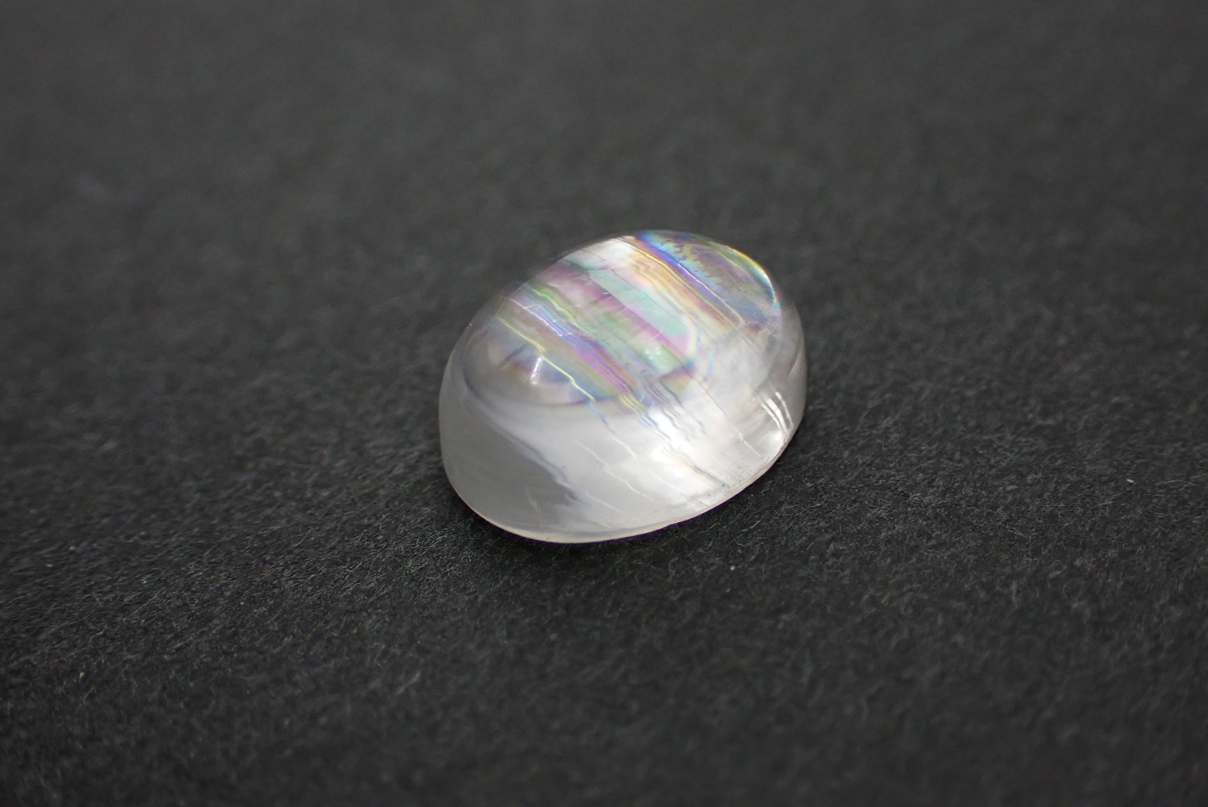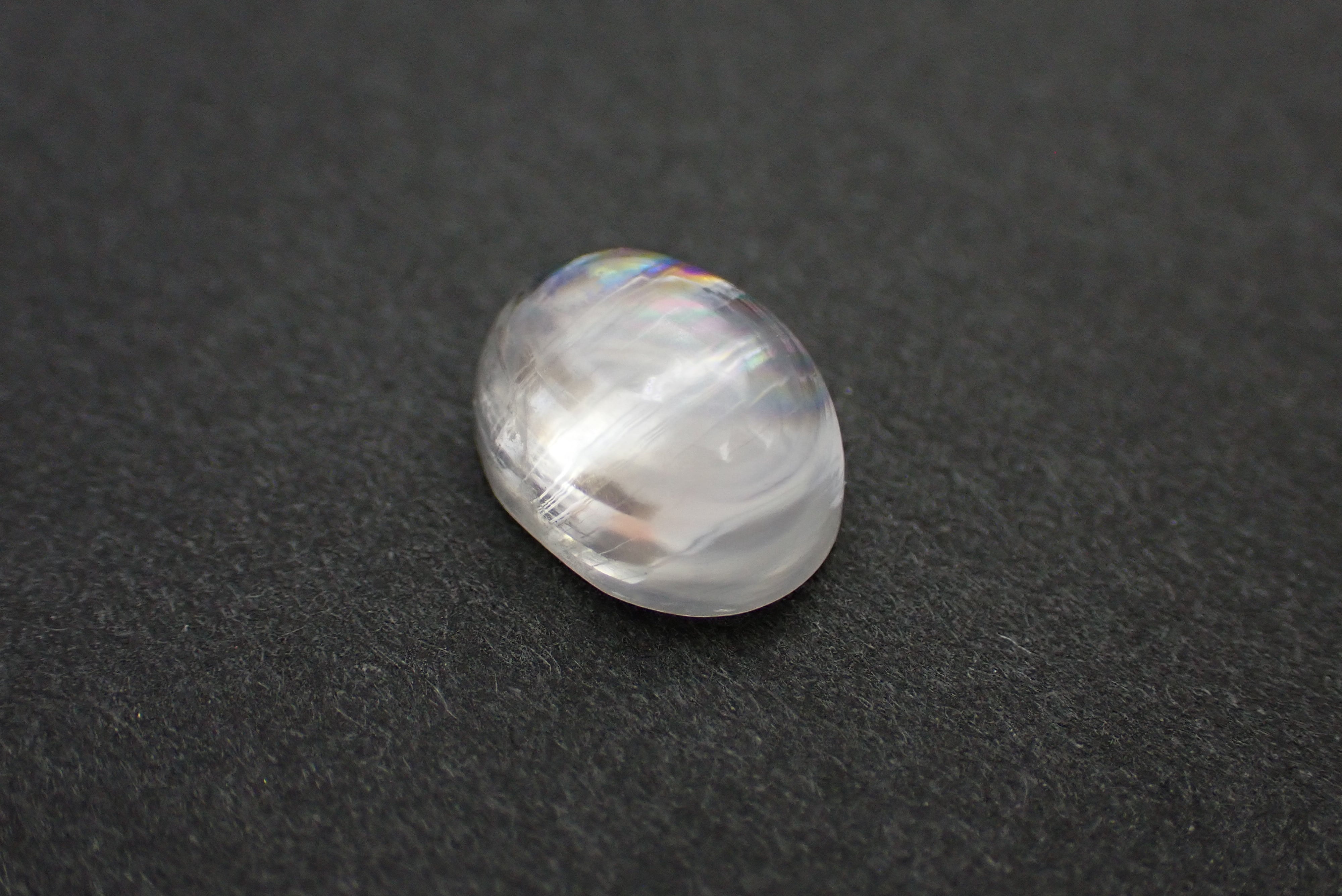 通常のムーンストーンとは異なるレインボーのシラーが特徴で、全体の柔らかいカラーの中にふとした時に見える鮮やかな色味がとても上品に光ります。