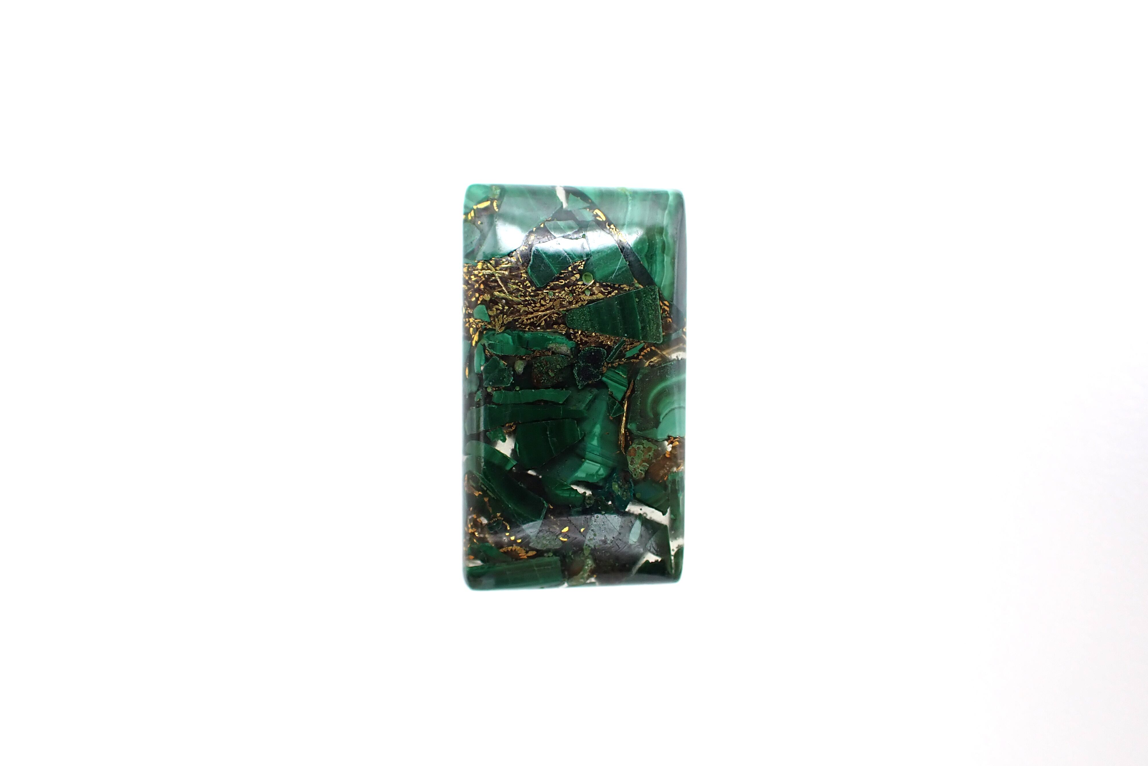細かいマラカイトと銅が混ざり合うことでヴィンテージ感のある華やかな見た目になりファッションジュエリーなどで人気の石です。